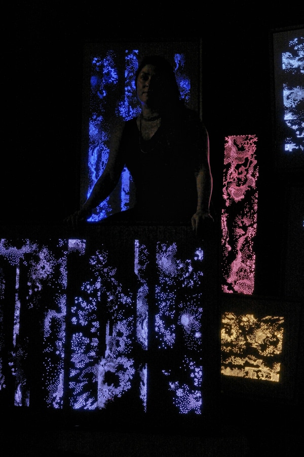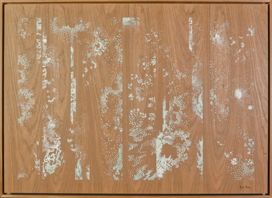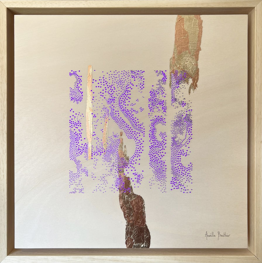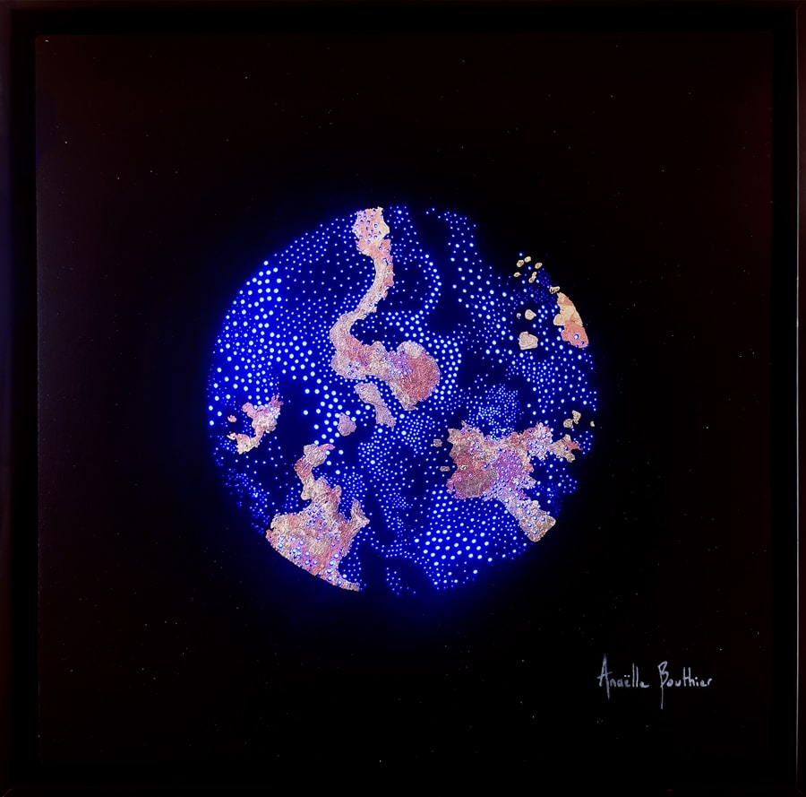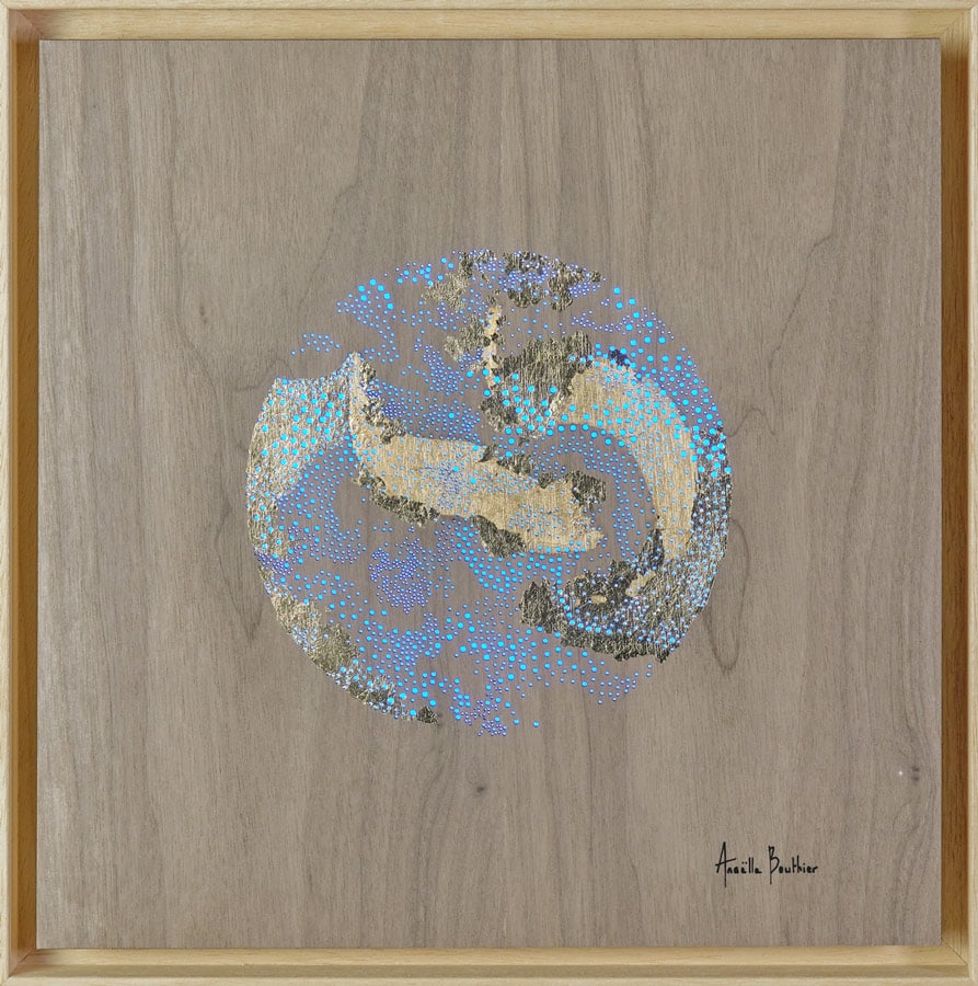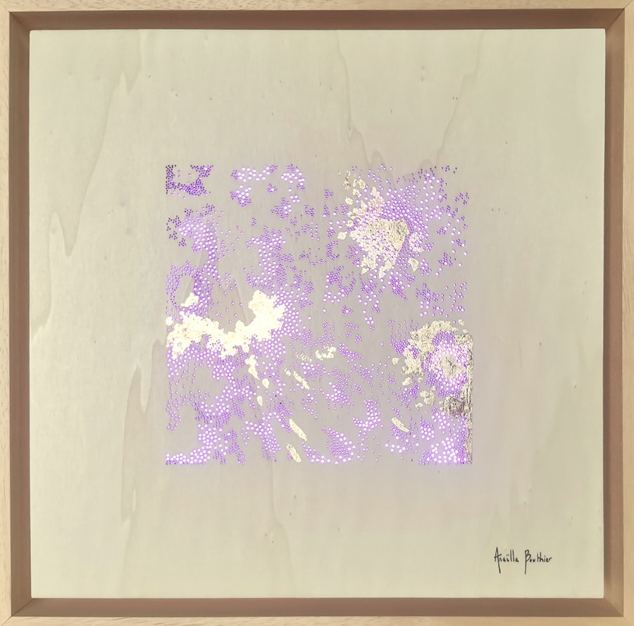 Artiste de la lumière, Anaëlle Bouthier perfore des essences fines de bois et explore la technique du pointillisme en bas-relief. Des myriades de percées sont révélées par un éclairage modulable. L’artiste invite l’observateur à se déplacer tout en regardant les œuvres afin d’éprouver la cinétique des spectres lumineux qui se transforment au grès du mouvement.